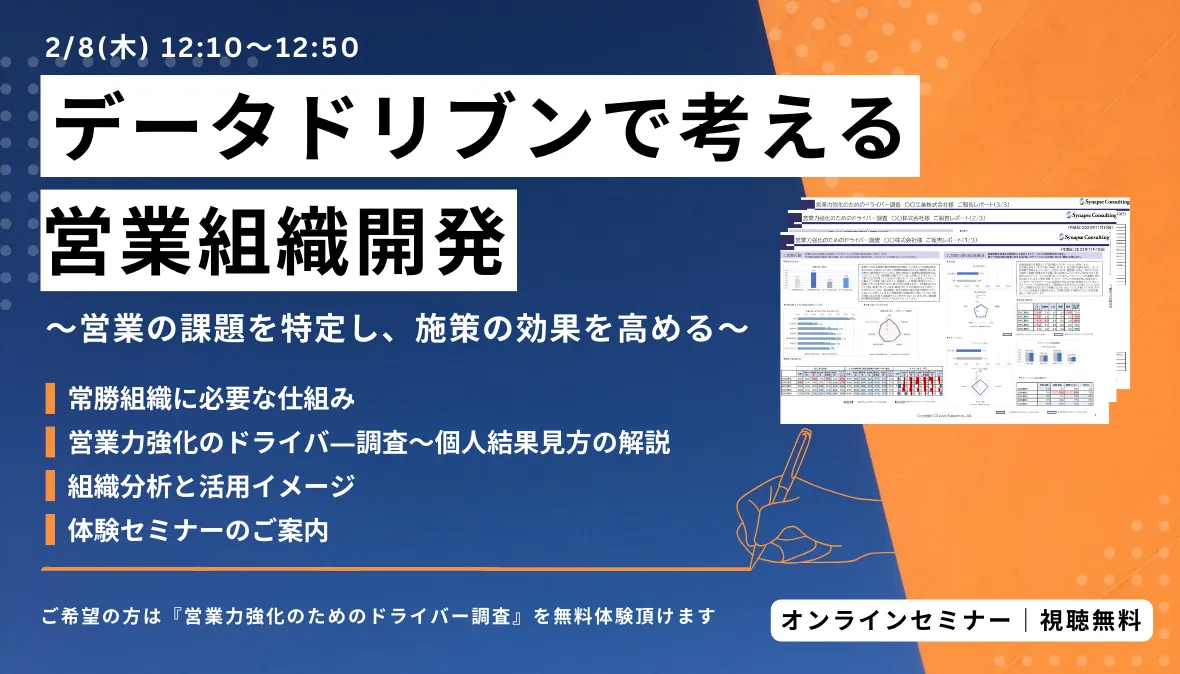 株式会社シナプスが主催するオンラインセミナー「データドリブンで考える営業組織開発」では、このような観点から営業課題を特定し、具体的な施策を見つけ出す方法を学ぶことができます。セミナーでは、法人営業が持つ特有の課題に応える形で、データを活用して営業力を高めるためのノウハウを提供します。