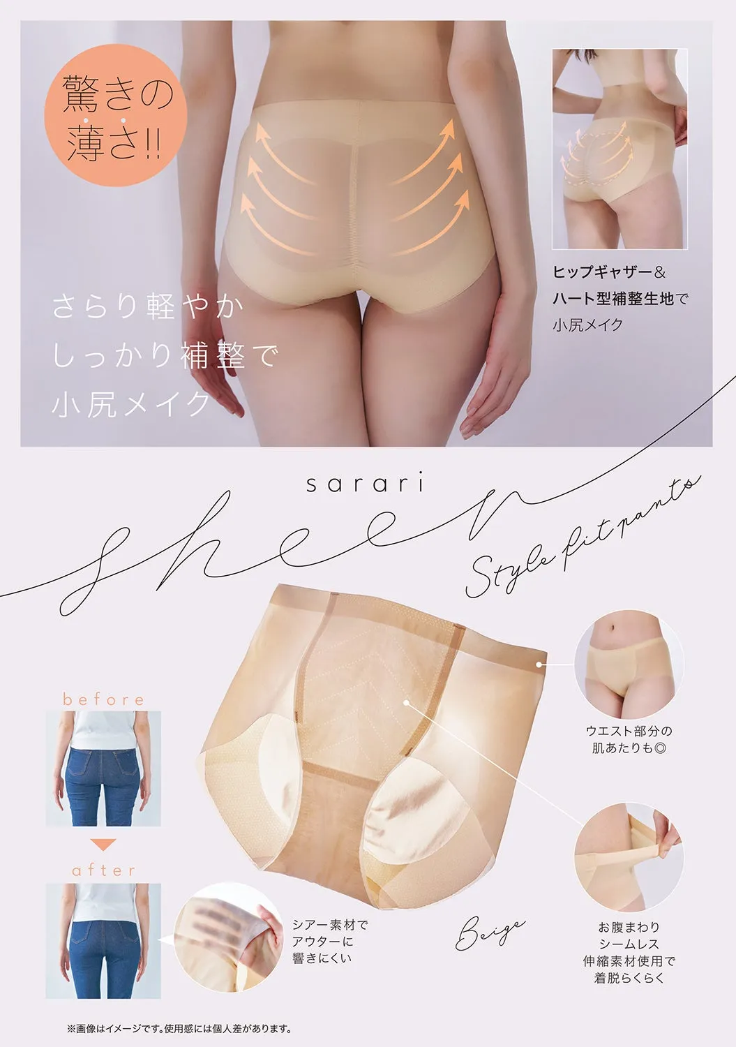 「サラリシアースタイルフィットパンツ」は、驚くほど薄いシアー素材を使用していますが、しっかりとした補整機能を備えています。ヒップ部分にはギャザーとハート型の補整生地を採用し、自然な丸みを持たせながら小尻効果を実現。アウターに響かないデザインなので、タイトなパンツやスカートの下にも最適です。