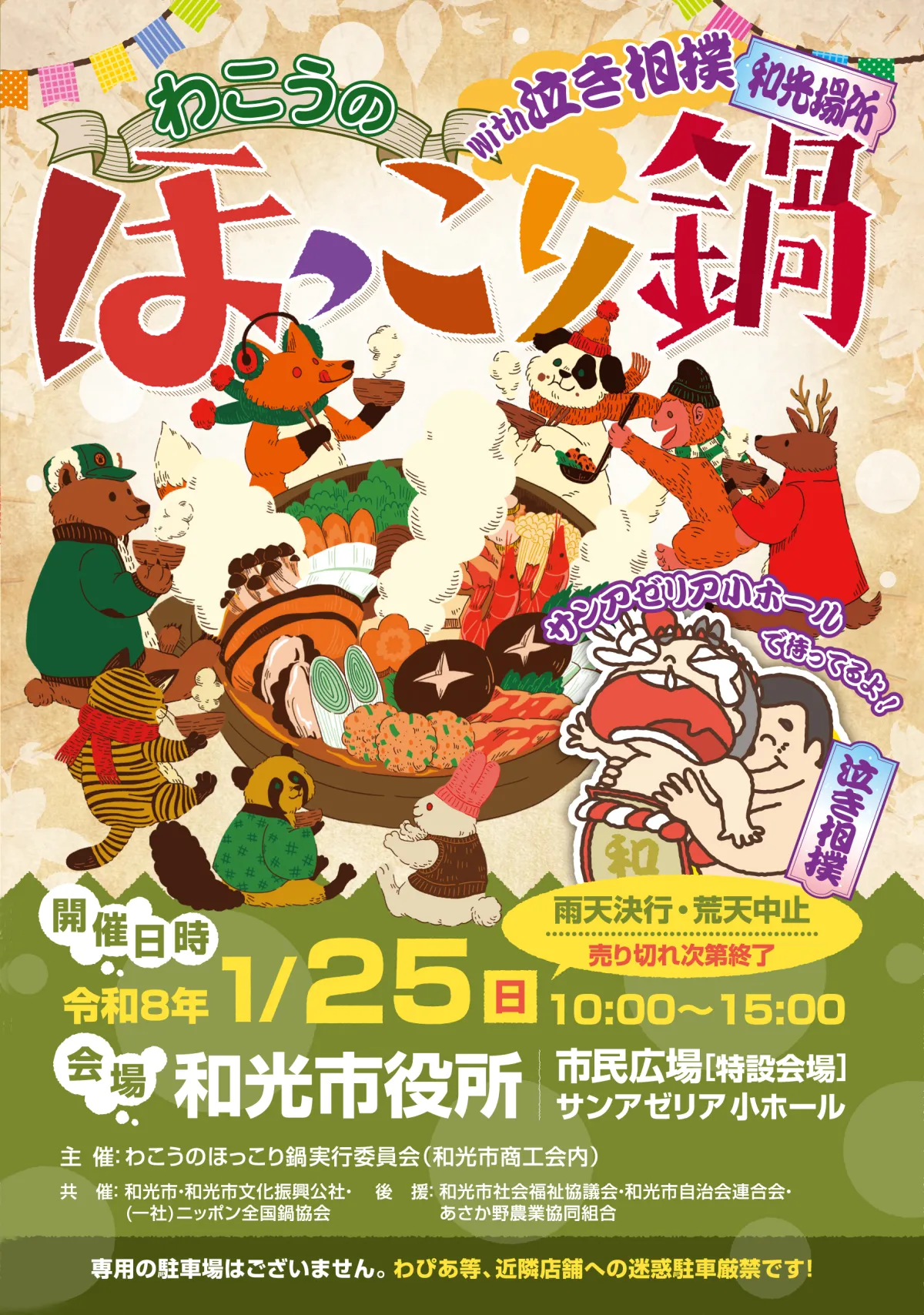 埼玉県和光市にて、2026年1月25日(日)に「わこうのほっこり鍋 with 泣き相撲 和光場所」が開催されます。このイベントは、地域の皆さまに愛されている冬の風物詩として毎年恒例のもの。特設会場でボリューム満点の鍋料理が楽しめる、家族連れや友人同士でも気軽に参加できるイベントです。