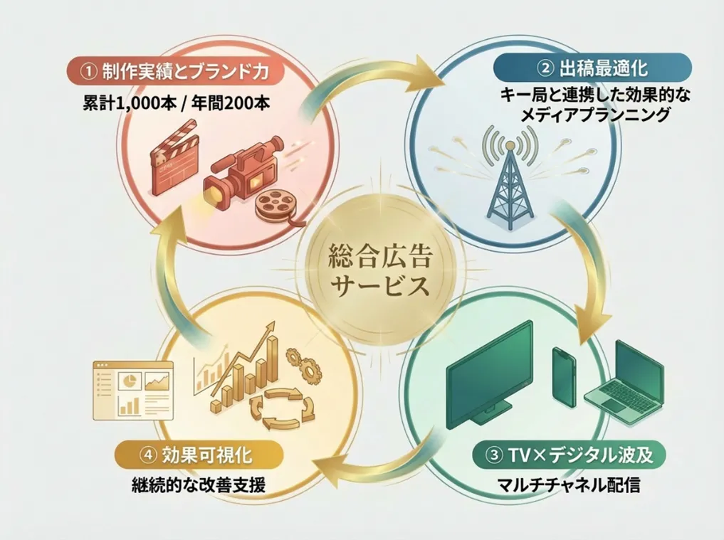 成果連動型料金設計:露出量を保証し、広告出稿の効率化を図ります。これにより、TVCMが単なる認知施策を越えて、売上につながる投資として機能します。