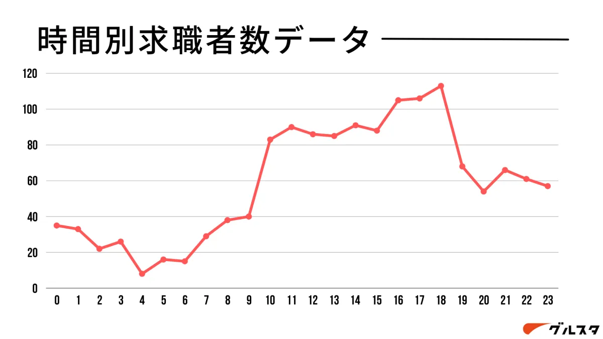 夜間(18時以降)は、勤務中の求職者が多いため、応募は減少しますが、17時や18時で終了した求職者が求人を確認するケースは見られます。21時前後には再び応募が増え、夜の時間帯にも一定数の求職者が活動していました。