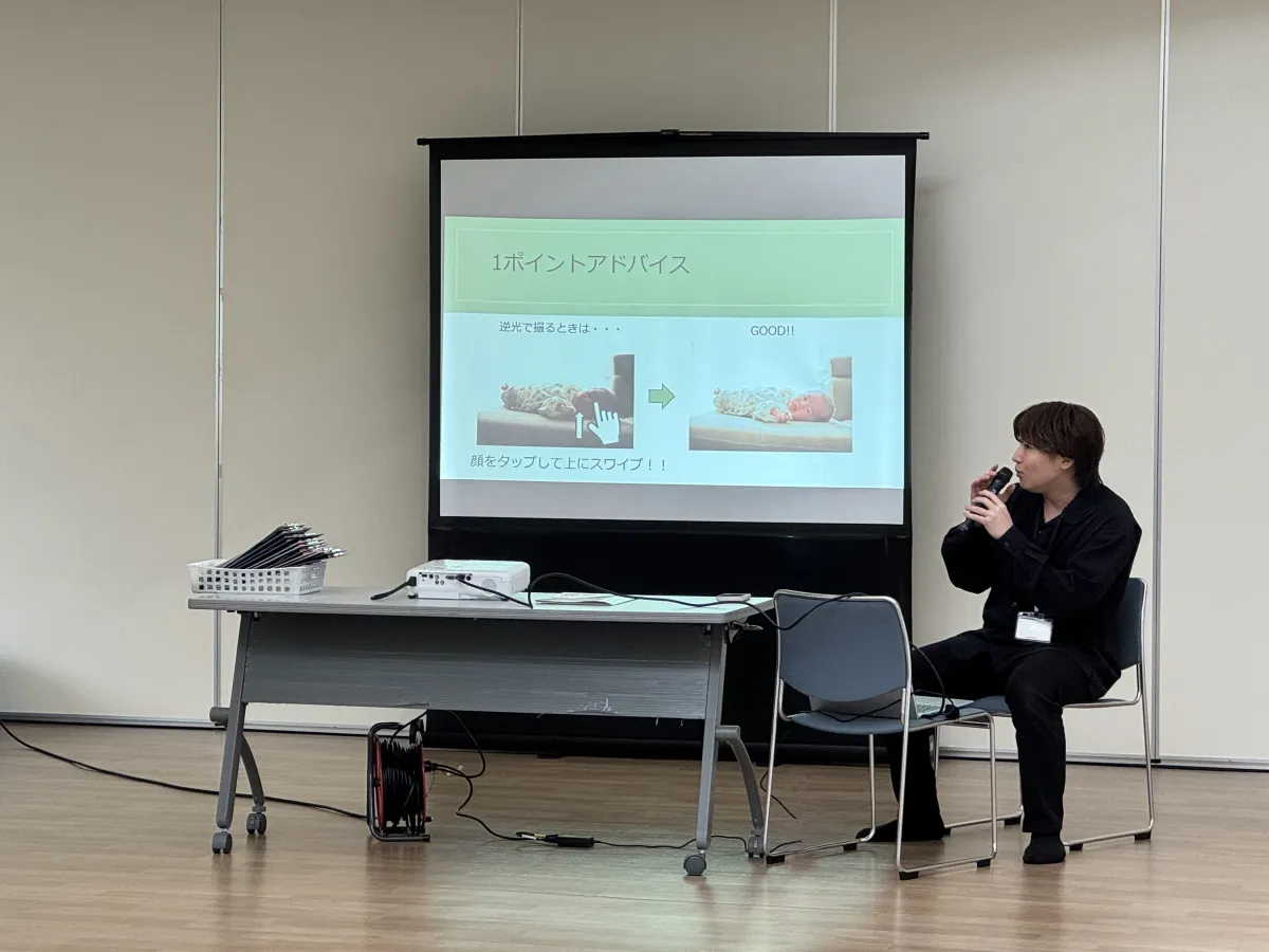 今年度は、育児休業を経た男性のプロカメラマンが講師を担当しました。講師は、自己の育児経験を生かし、実践的な視点を持った撮影アドバイスを提供。参加者は自身のスマートフォンを使って、実際にお子さまを撮影する練習も行い、すぐに家庭で利用できる内容となっています。