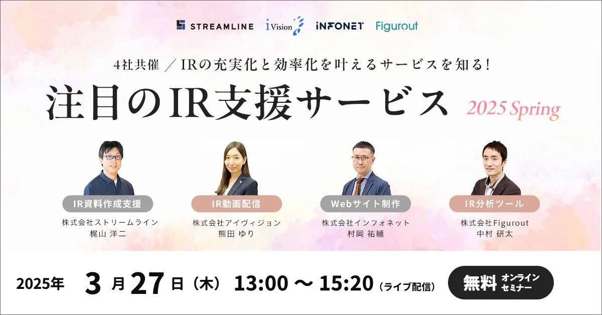 株式会社ストリームライン(本社:東京都品川区、代表取締役:梶山洋二)は、2025年3月27日午後1時から、オンラインセミナー「注目のIR支援サービス 2025 Spring」を開催します。このセミナーは、株式会社インフォネットなど4社の共催により行われ、無料で参加いただけます。