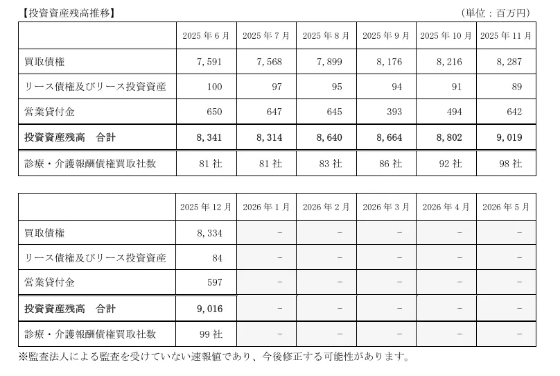 2025年12月の段階では、新たに2社との取引を始めました。一つは債権買取を行う企業、もう一つは貸付を行う企業です。これにより、買取債権が46百万円の増加を見せましたが、一方で営業貸付金の回収やリース債権の減少が影響し、総計で前月比2百万円の減少を記録しました。しかしながら、今後の動向として、2026年の下半期には上半期を上回るペースで投資資産残高が増加していく見込みです。特に2026年1月以降は、既存の取引先の利用拡大に加え、新たな案件の実行が期待されており、今後の成長が見込まれています。