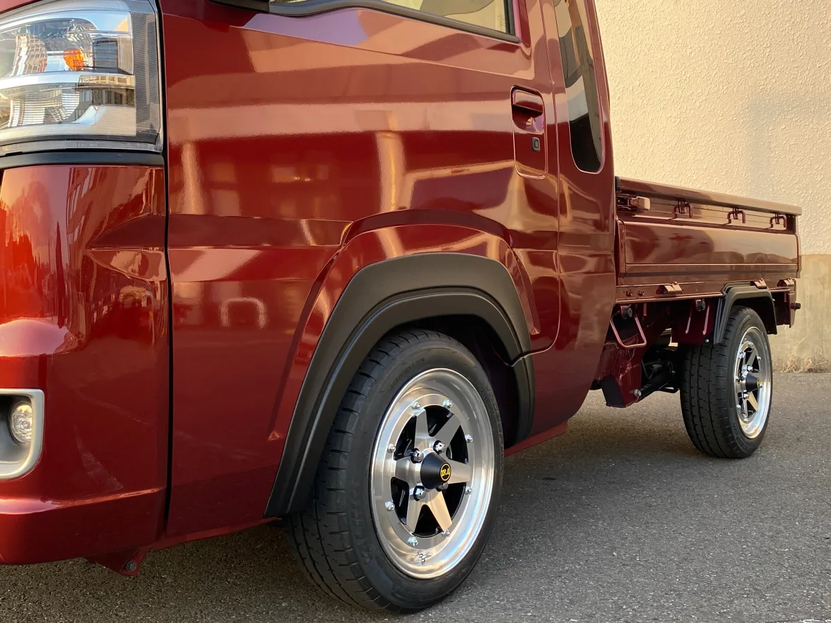 スタイルの向上だけでなく、実用性にも配慮されています。タイヤの張り出しをしっかりとカバーする設計なので、日常の使用からアウトドアのシーンまで、さまざまな場面で機能します。軽トラックはシンプルなデザインが多い中、ワイドフェンダーは一つのアクセントとなり、個性的なスタイルを演出します。