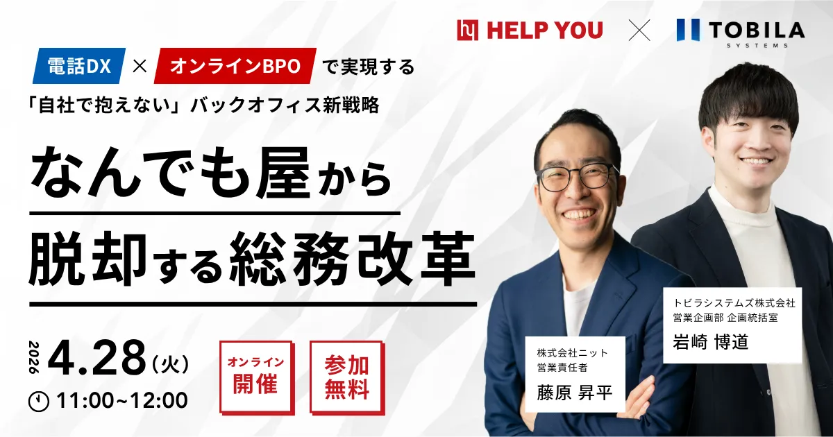 2026年4月28日(火)に、トビラシステムズ株式会社と株式会社ニットが共催するウェビナーがオンラインで開催されます。このセミナーでは、多くの企業が直面している総務業務のDX(デジタルトランスフォーメーション)に関する課題と解決策について詳しく解説します。