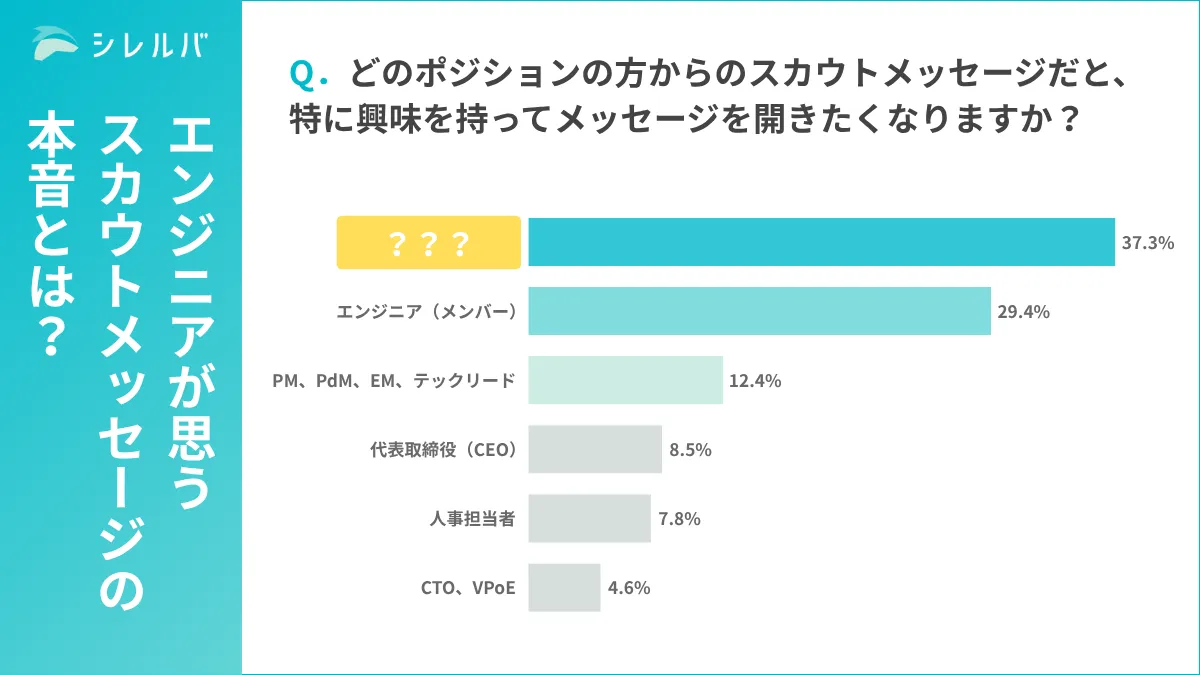 次に、どの立場の方からのスカウトメッセージに興味が湧くかという項目では、最も多かった回答が「ポジションは関係ない」というもので、37.3%を占めました。しかし注目すべきは、「エンジニア(メンバー)」からのスカウトが29.4%と多く挙げられている点です。現場で実際に働くエンジニアからの直接のメッセージは、よりリアルな情報を得られる期待感を持たれることを示しています。