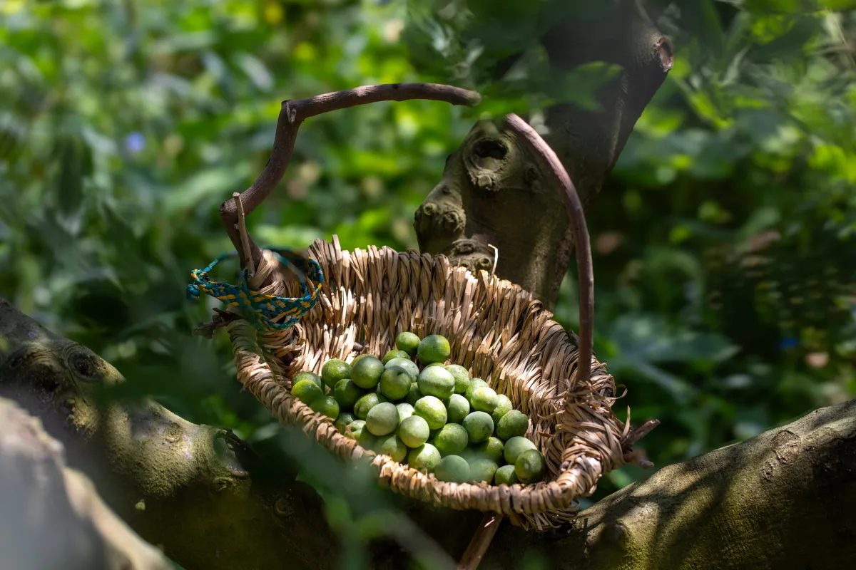今回のワークショップは、国東市在住の七島藺工芸作家、岩切千佳さんを講師に迎え、オリーブと七島藺を組み合わせた独自の収穫かご「バスケタリー」を作る内容となっています。参加者は、あらかじめ準備されたオリーブの枝を使い、七島藺を編み込んで自分だけのバスケタリーを作成。その後、できたかごを使って旬のオリーブの実を少しだけ収穫し、記念として持ち帰ることができます。