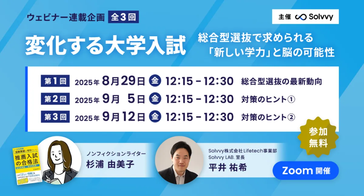 昨今の大学入試は、新たな形態である「総合型選抜」が注目を集めています。特に、2024年度の入試に関する文部科学省の発表によれば、全体的な入学志願者数は減少する一方、総合型選抜での受験者数は増加していることが報告されています。この新たなトレンドに対応すべく、Solvvy株式会社は、著名な受験ジャーナリスト杉浦由美子氏を迎えたオンラインセミナーを開催します。