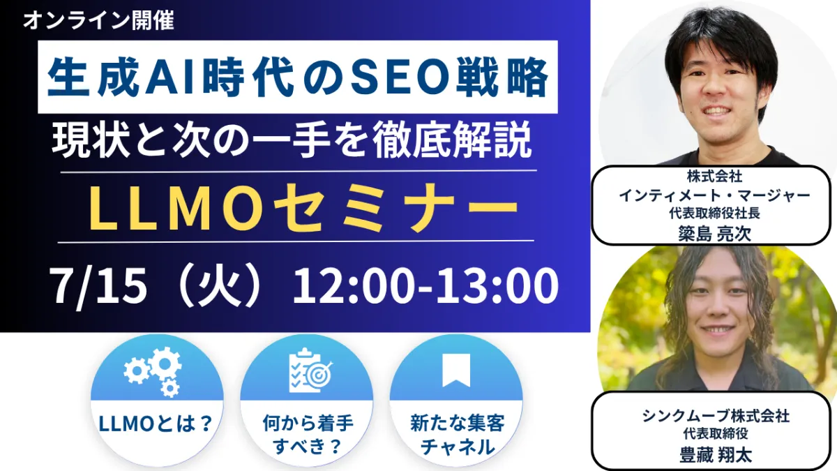 このような背景から、シンクムーブ株式会社と株式会社インティメート・マージャーは、2025年7月15日(火)にオンラインセミナー「生成AI時代のSEO戦略:現状と次の一手を徹底解説」を開催します。このセミナーでは、LLMとSEOの融合による新しい取り組みを解説します。