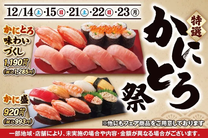 12月14日(土)から小僧寿しで『特選かにとろ祭』が開催されます。このイベントでは、冬の定番とも言える「かに」と、南鮪中とろを贅沢に使用したメニューが揃います。期間は12月14日(土)から15日(日)、さらに21日(土)から23日(月)までの限定での実施となります。期間中、さまざまな種類のかに料理と南鮪中とろを楽しむことができます。