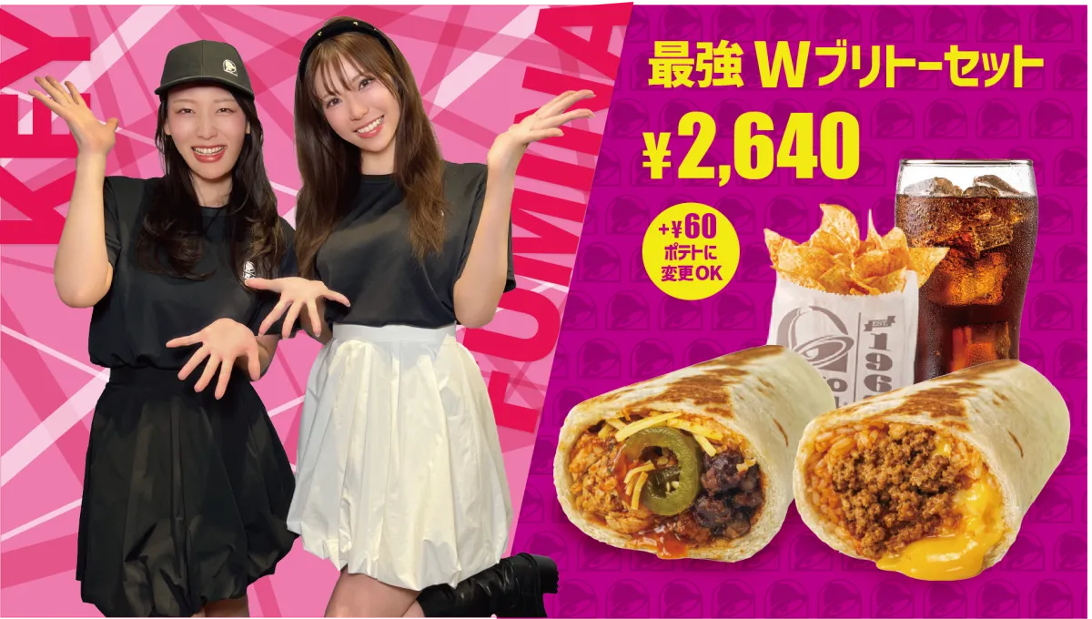 タコベルは全国の店舗で、鈴木ふみ奈さんと風吹ケイさんとのスペシャルコラボメニューを期間限定で提供します。このコラボメニューは、鈴木ふみ奈さん監修の「背徳の倍チーズブリトー」と風吹ケイさん監修の「覚醒の旨辛ビーンズブリトー」の2品です。販売は2026年3月12日から4月30日の間で、価格はどちらも税込1,500円での提供となります。さらに、二人のコラボによる特別セット「最強Wブリトーセット」も登場します。こちらは税込2,640円です。