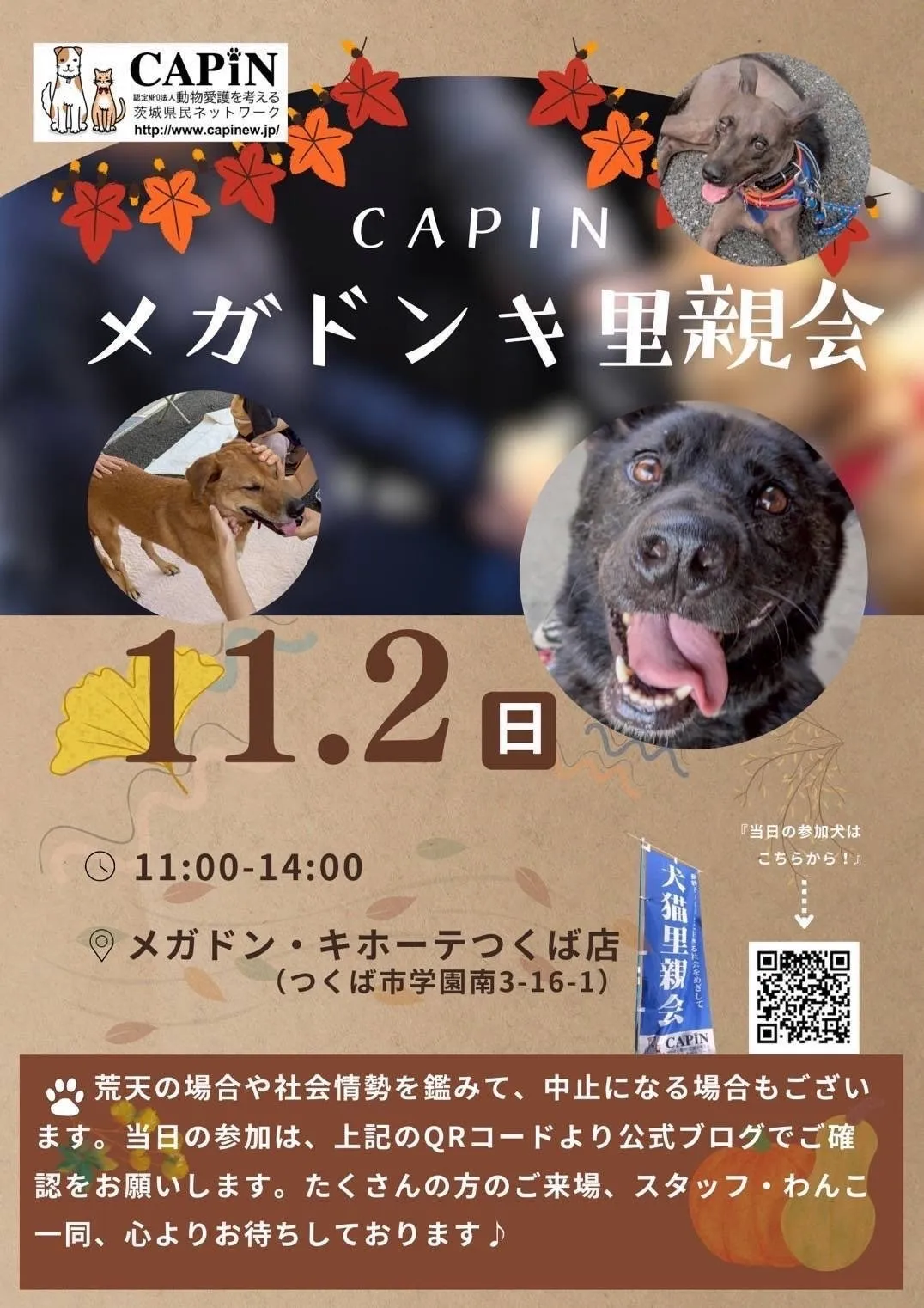 2025年11月2日(日)には、茨城県つくば市のメガドン・キホーテにて、動物保護団体CAPIN主催の「CAPINメガドンキ里親会」が行われます。このイベントは、保護された犬たちが新しい家族との出会いを待つ場として、多くの方々をお迎えします。開催時間は11:00から14:00までです。