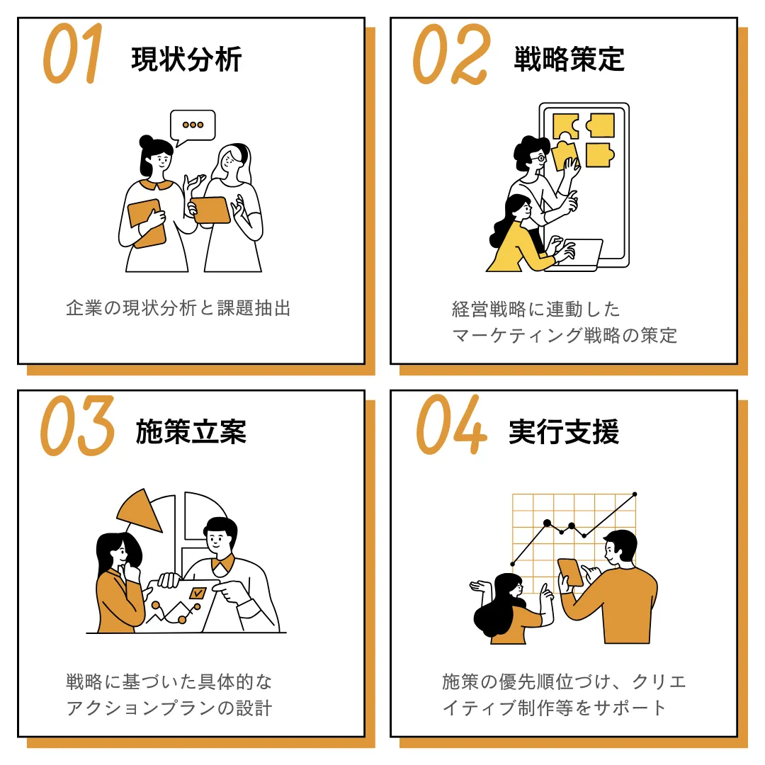 このようなニーズに応えるべく、これまでの経験と蓄積された知見を基に、戦略的かつ包括的なマーケティングコンサルティングを提供することを決定しました。企業が持続的に成長するための強力なサポートを目指しています。