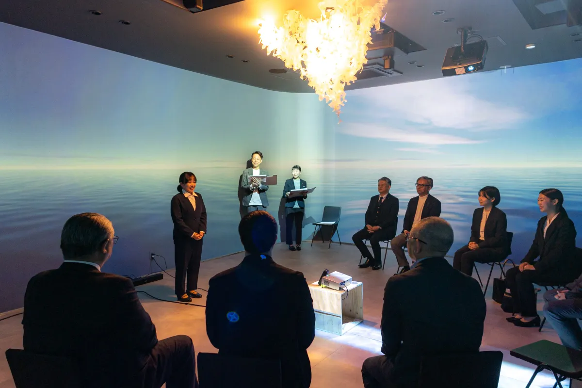 「muni」は「お葬式はもっと自由でいい」という理念のもと創設された場所です。式の冒頭では、西河誠人代表取締役が新入社員に向けて激励の言葉をかけ、その後、2名の新入社員は自らの決意を述べました。咄嗟の緊張感の中で辞令が交付され、彼らは社会人としての最初の一歩を踏み出しました。