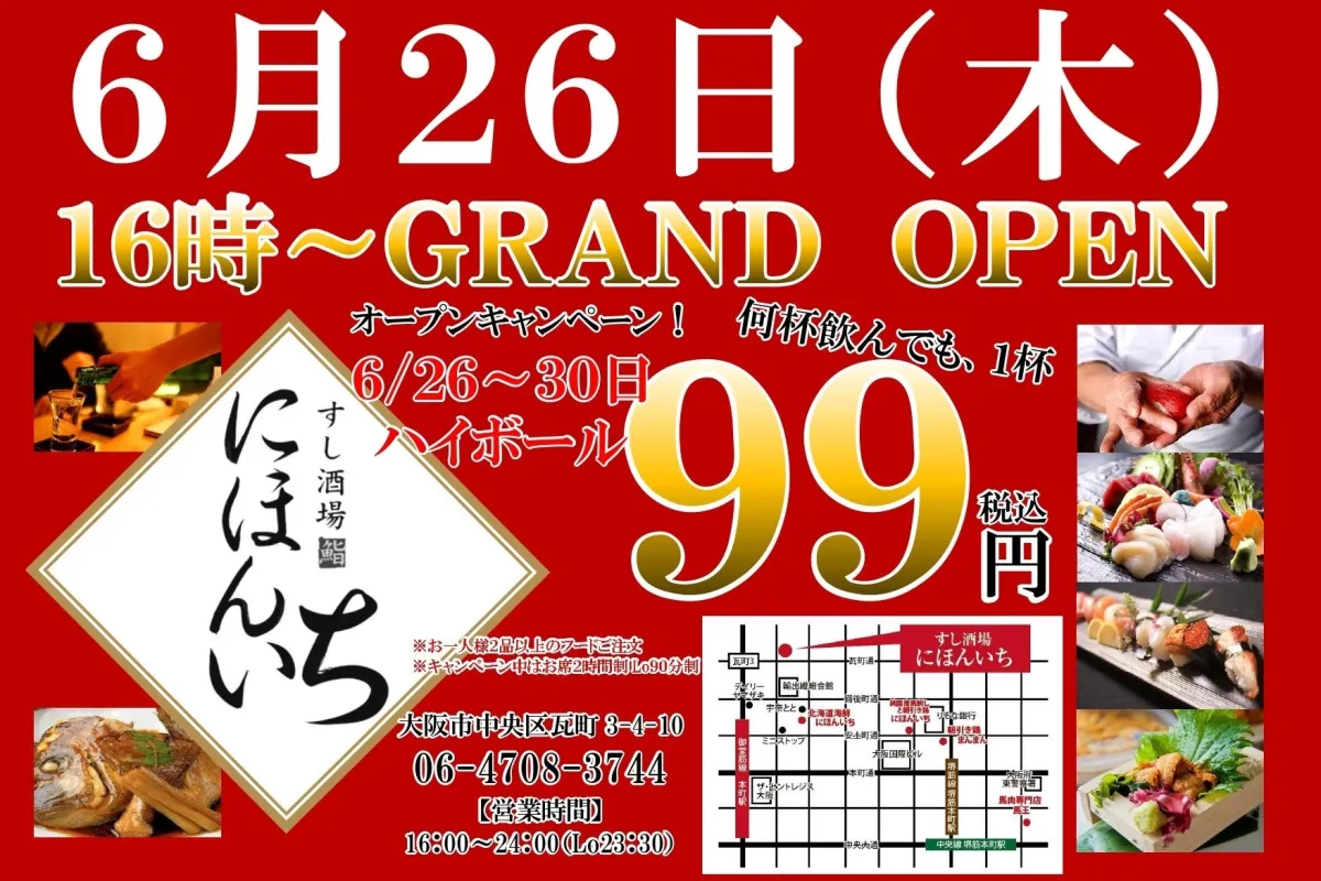 大阪・本町エリアに、待望の新店「すし酒場 にほんいち 本町店」がオープンします。6月26日(木)の16:00から開店し、先着のお客様には特別キャンペーンとしてハイボールがたった99円で楽しめるという嬉しいご案内があります。このキャンペーンは、2025年6月30日(月)までの5日間限定です。