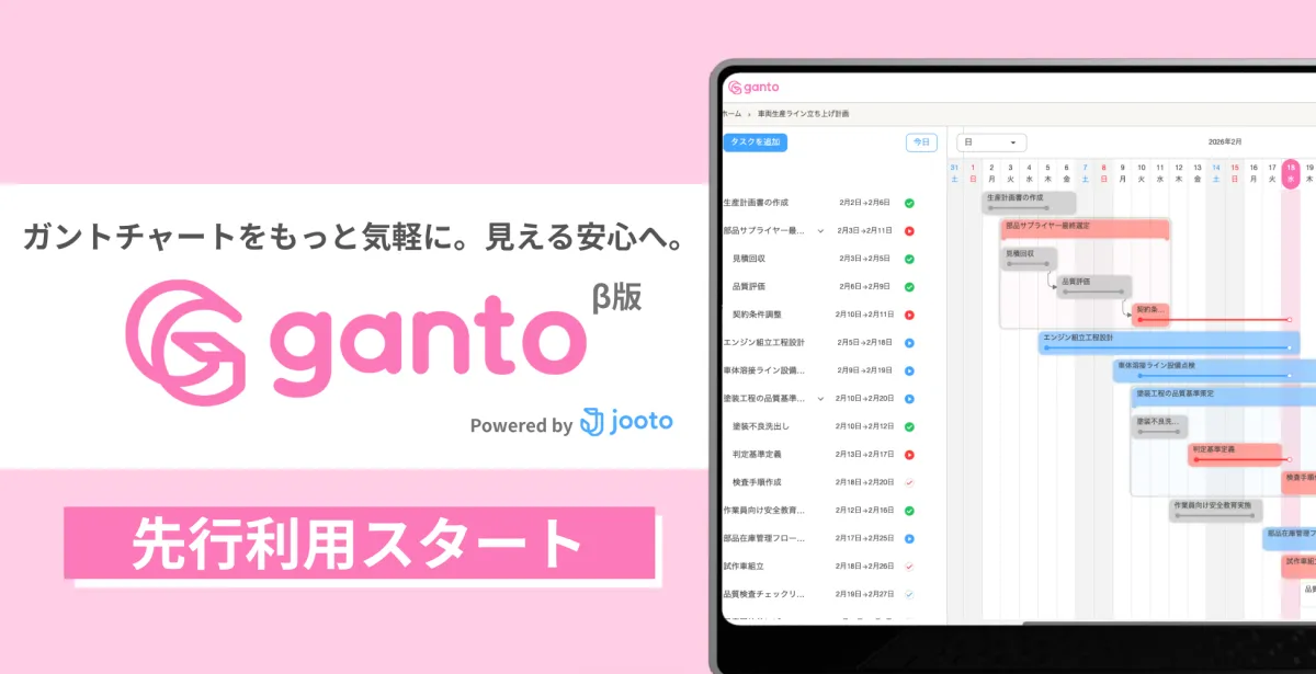 株式会社PR TIMES(東京都港区、代表取締役:山口拓己)によって開発された新しいタスク・プロジェクト管理ツール『Ganto(ガントー)』が、2月27日からβ版の先行利用を開始しました。このツールは、従来のJootoの機能を活用しながらガントチャートに特化したもので、2026年9月の正式リリースを目指しています。