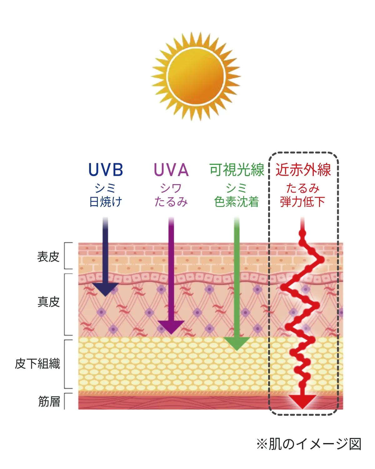 太陽光の脅威は熱中症だけではありません。長期間にわたって太陽光、特に紫外線を浴び続けることで引き起こされるのが「光老化」です。シミ、シワ、たるみといった加齢による肌の症状は、実は8割がこの光老化によるものだと言われています。肌の弾力やハリが失われ、見た目の老化を加速させるだけでなく、皮膚がんや光線過敏症といった深刻な健康リスクにも繋がる可能性があります。近赤外線もまた、皮膚深部への影響により、肌の健康に無関係ではありません。全身の肌を守ることは、美しさと健康を維持する上で不可欠なのです。