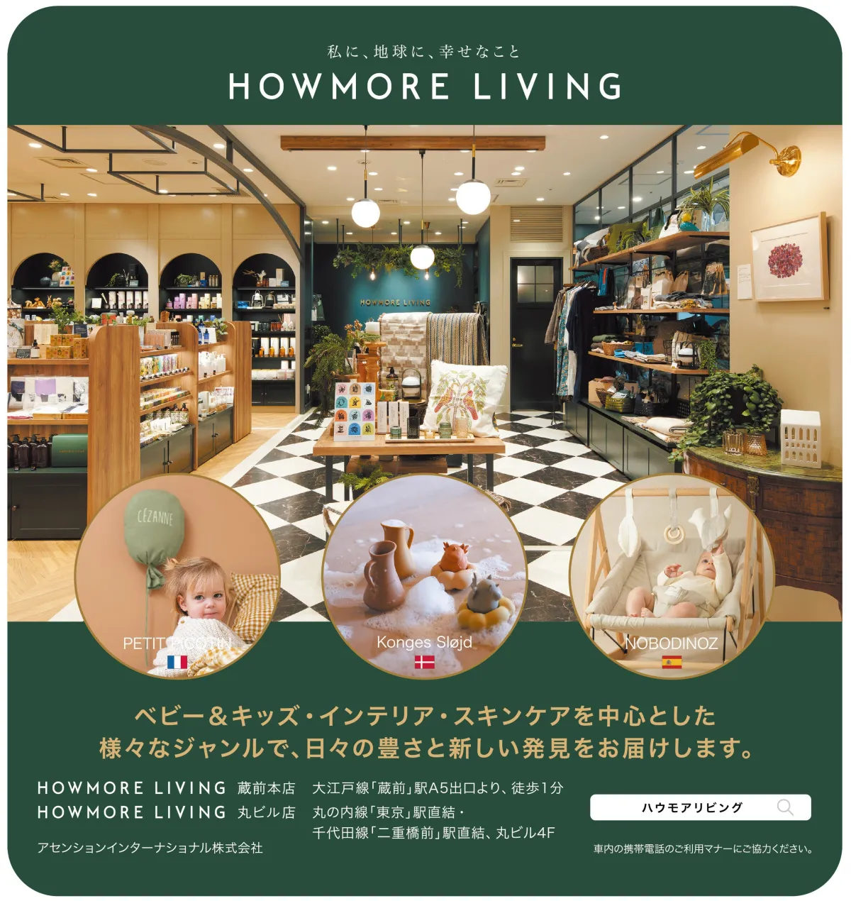 「私に、地球に、幸せなこと」をテーマに、ベビー&キッズ、インテリア、スキンケアを中心としたアイテムを展開するライフスタイルショップ『HOWMORE LIVING(ハウモア リビング)』は、2024年6月12日より、都営地下鉄大江戸線の優先席エリアにおいて、マタニティマークとのタイアップ広告の掲出を開始しました。