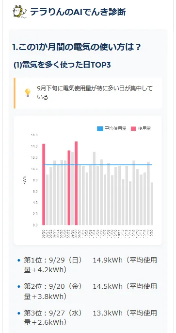 「テラりんのAIでんき診断」では、これらのサービスをさらに進化させ、蓄積したデータを深く分析できるAIを導入しています。このAIは、各家庭の電力使用特性や生活リズムに関する情報を学習し、より個別に最適化された節電アドバイスを提供します。