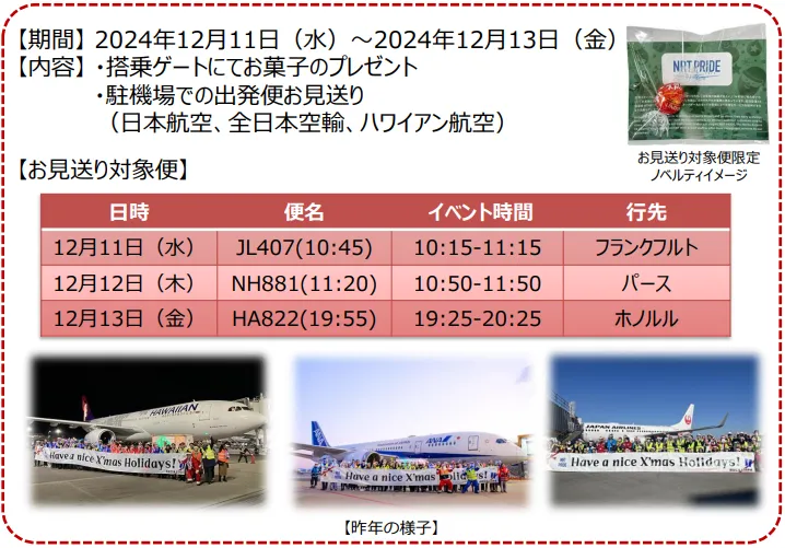 この取り組みは、お客様に日頃の感謝の気持ちを伝え、 joyousなクリスマスホリデーを過ごしてもらうことを目的としています。お見送りは、日本航空、全日本空輸、ハワイアン航空の3便に対して行われ、これらの航空会社を利用する人々にとって印象に残る体験となるでしょう。