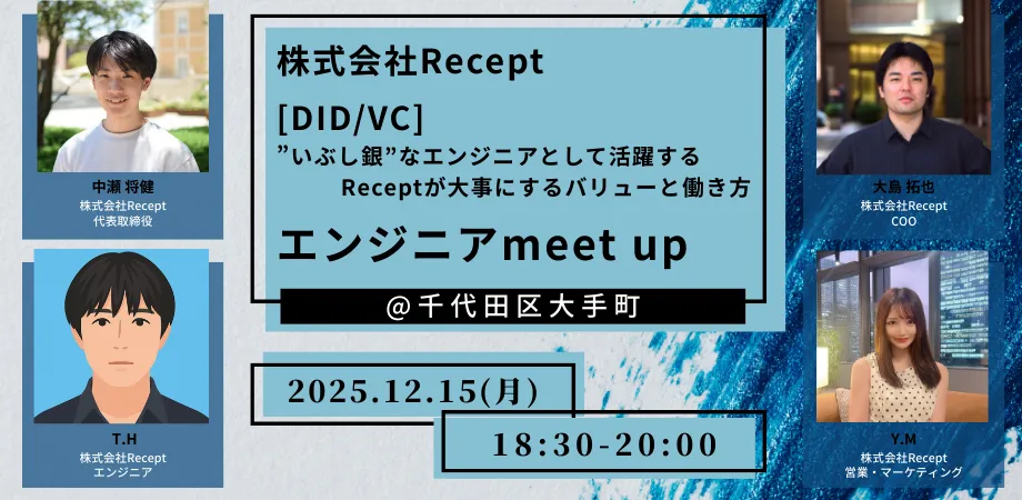 主催する株式会社Receptは、デジタルアイデンティティ分野で革新的な技術を提供しており、エンジニアたちのキャリア形成や技術の発展をサポートしています。今回のmeetupでは、Receptが手掛けるDID/VC事業「proovy」について、同社の経営陣やリードエンジニアたちがテーマに沿ってお話しします。特に、「スタートアップで働くメリット」や「実践的な技術選定とアーキテクチャ設計」に関する視点が紹介される予定です。