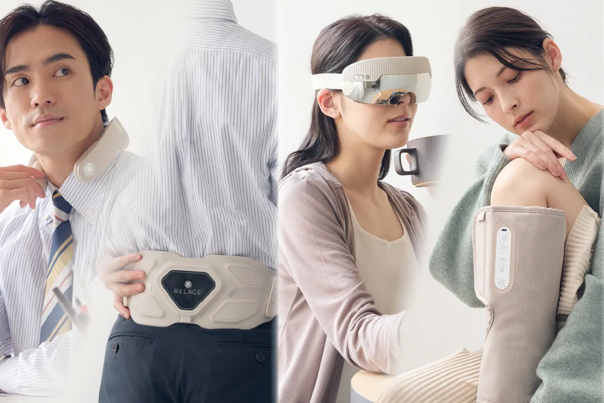 新ブランドの理念である「未来の癒しを、リビングに。」を掲げるRELAGEは、特に首、腰、脚、目元といった疲労が溜まりやすい部位に特化したケアを提供します。軽量でスタイリッシュなデザインの『Comfortシリーズ』では、EMS(低周波)、温熱、振動、加圧のトリプル機能を合わせた新感覚の製品が揃っています。