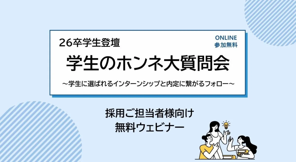 2025年7月30日、大学生協事業連合UNIVCOOPキャリアナビ事務局が主催した「学生のホンネ大質問会」がオンラインで開催されました。このウェビナーでは、26卒を控える大学生3名が登壇し、企業担当者からの質問に答え、インターンシップに関するリアルな体験や意見を共有しました。この取り組みは、企業が学生の本音を学び、より良い採用活動を展開するための貴重な機会となりました。