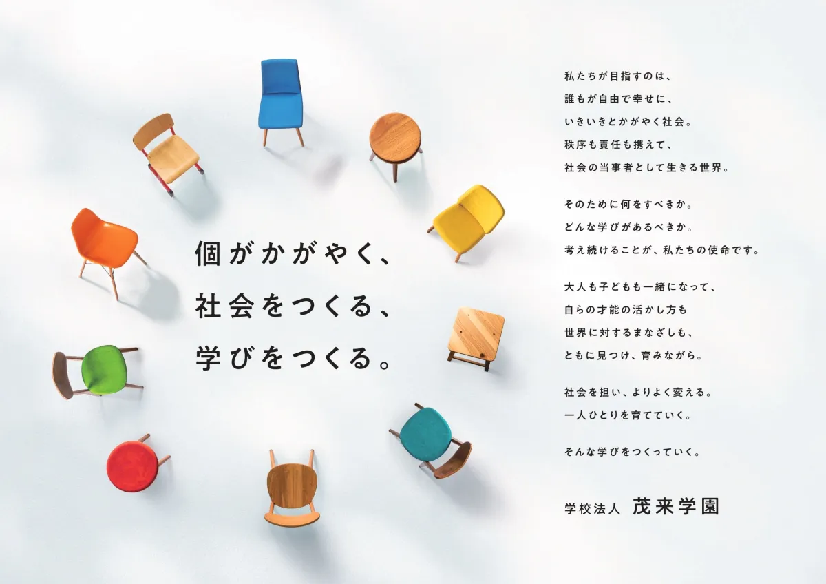 新たに策定されたブランドビジョンは、特に椅子のモチーフに象徴されています。この椅子は、多様な人々が集まり、共に学び合い、未来を創造していく場としての役割を果たすことを願っています。茂来学園が開かれた学びの場として、様々な人々と出会い、学び合うことを大切にしていることがここに示されています。