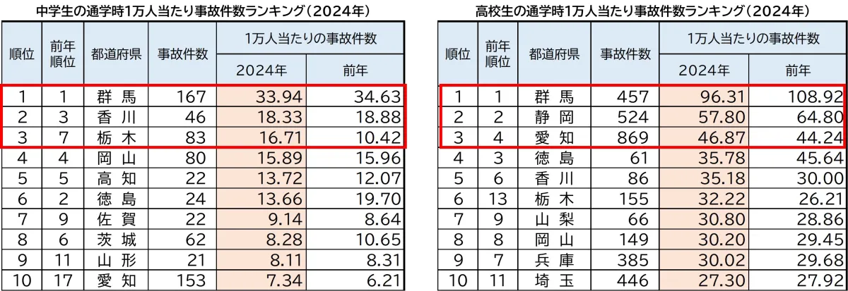 群馬県は中学生・高校生ともに事故件数が最も多く、特に注意が必要です。また、この調査は自転車に関する交通法規が改正される前の分析結果であり、通学時の安全対策が今後も重要とされています。