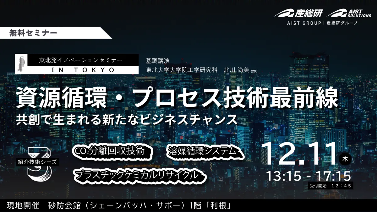 2025年12月11日、東京で資源循環とプロセス技術に焦点を当てたリアルセミナーが行われます。今回は第3回目となり、初めて東京での開催となります。このセミナーは、化学プロセス研究部門の最新の研究成果や材料開発に関する情報を、企業や研究者の皆さまに届けることを目的としています。