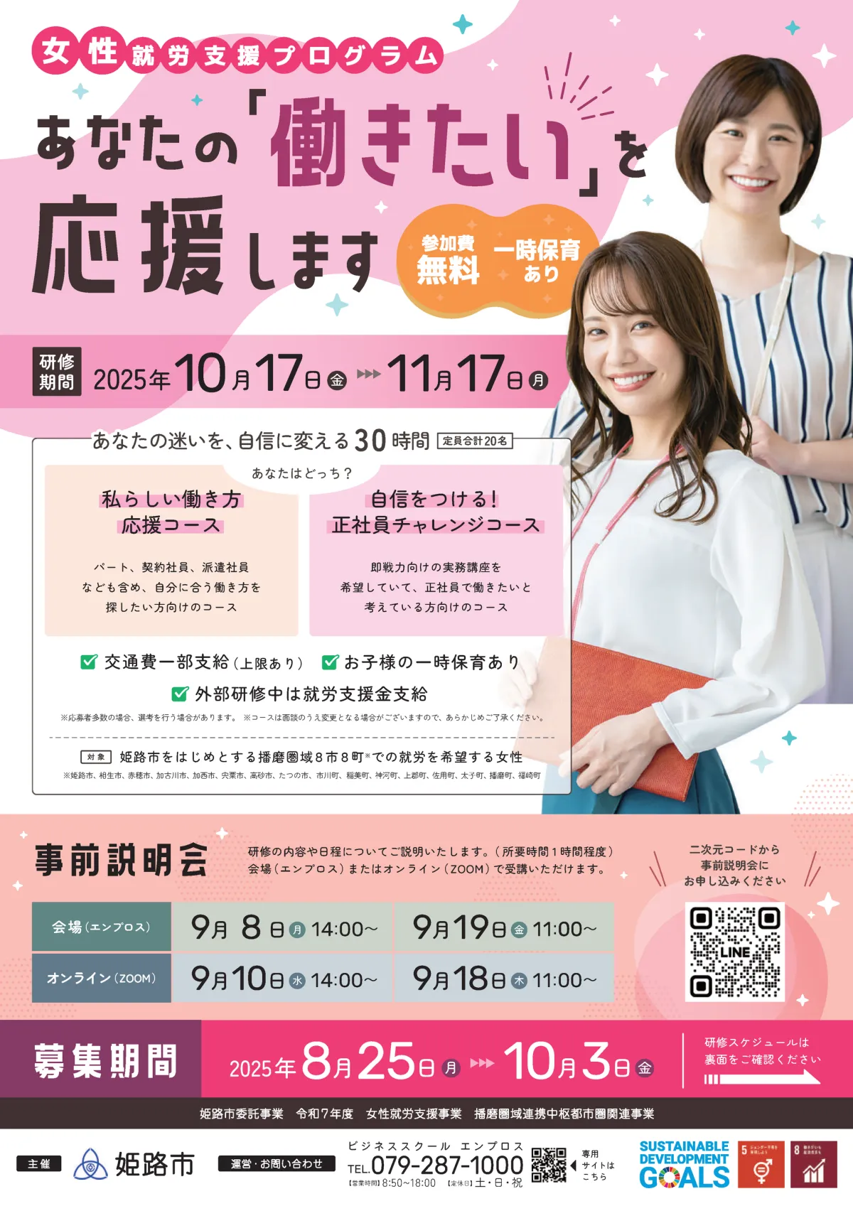 申し込みは、女性就労支援プログラム専用サイトから行える他、電話(079-287-1000)の受付も行っています。