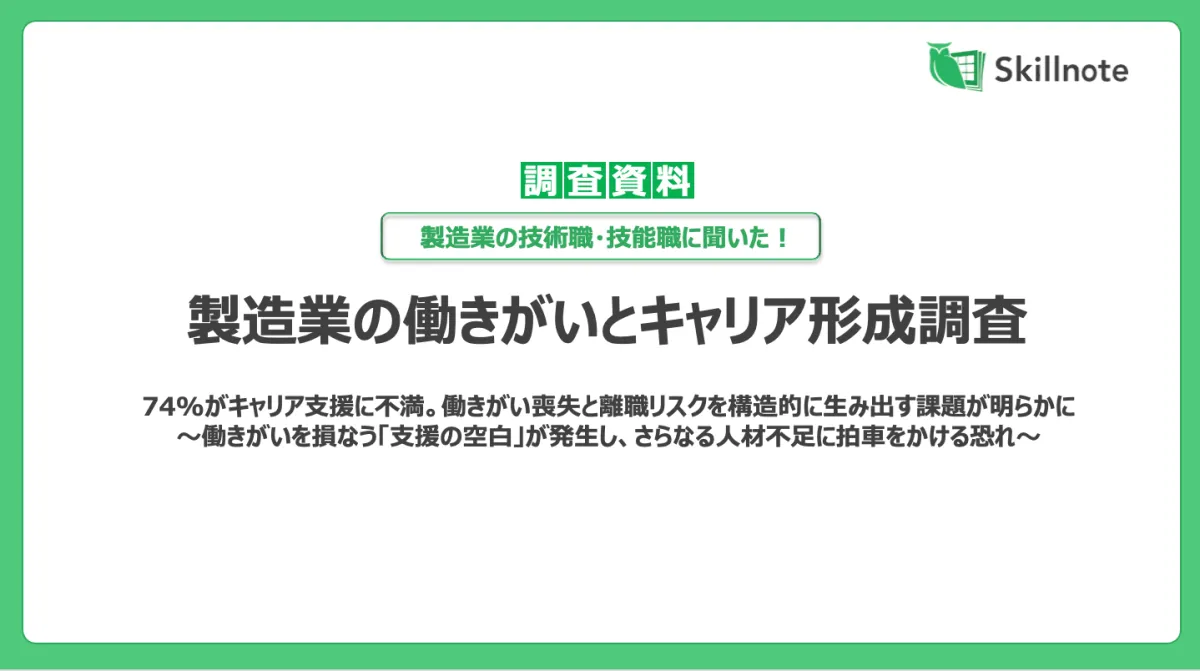 製造業は日本経済において重要な役割を果たしていますが、近年その現場で働く人々の働きがいが低下し、離職リスクが高まっています。株式会社Skillnoteが運営する「スキルマネジメント研究所」が実施した調査によると、技術職と技能職に従事する342名のうち、74%がキャリア支援に不満を抱えていたことが分かりました。この結果は、特に製造業界の今後の人材育成において、大きな警鐘を鳴らしています。