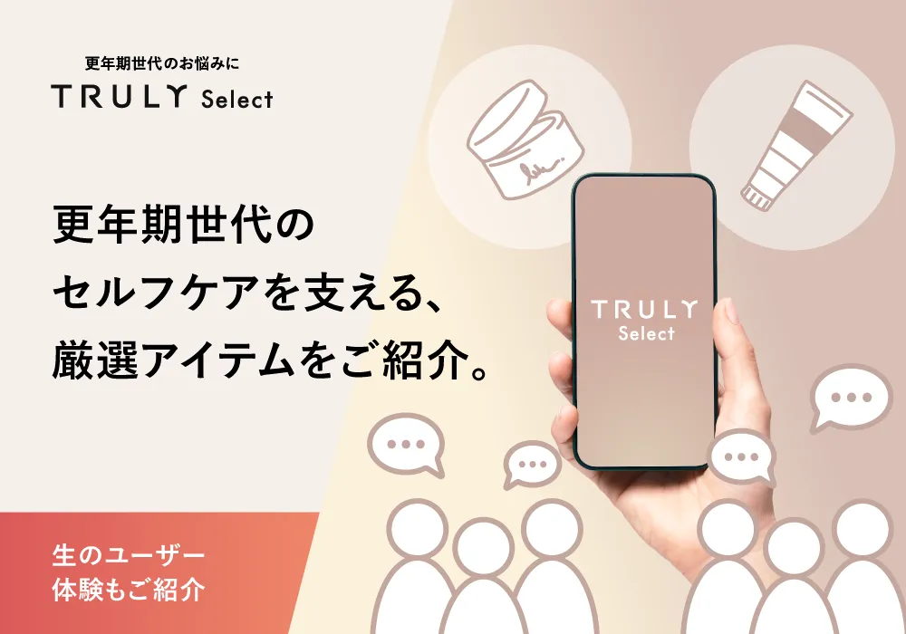 「TRULY SELECT」は、更年期やホルモンバランスの変化に関心を持つ男女を対象とした共創型のプラットフォームで、参加者が製品やサービスについての意見を交わし合い、製品改善につなげていく取り組みです。参加者は専用サイトから対象となる製品を選び、自身の使用感や提案を投稿することで、実際に改善された製品の恩恵を受けることができます。これにより、「もっとこうだったらいいのに」という声を形にし、製品やサービスの向上に結び付けています。