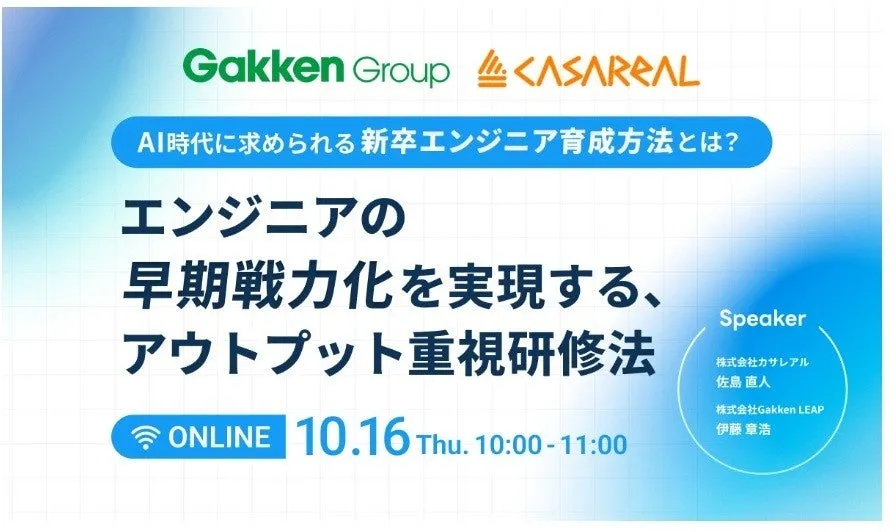 2025年10月16日、株式会社Gakken LEAPと株式会社カサレアルが共催する無料オンラインセミナー「AI時代に求められる新卒エンジニア育成方法とは」が開催されます。本セミナーは、新たな技術が急速に進化する現代において、特に新人エンジニアの育成法に特化した内容となっています。