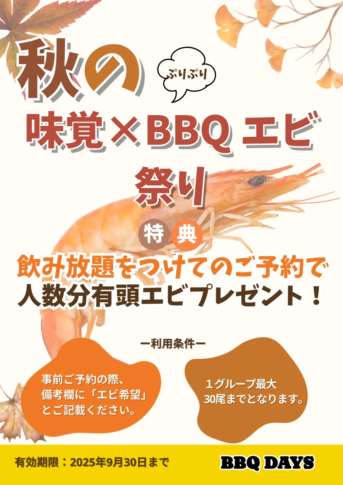 この秋、美味しいエビを味わいながら、楽しいひと時をBBQ DAYSで過ごしてみてはいかがでしょうか?