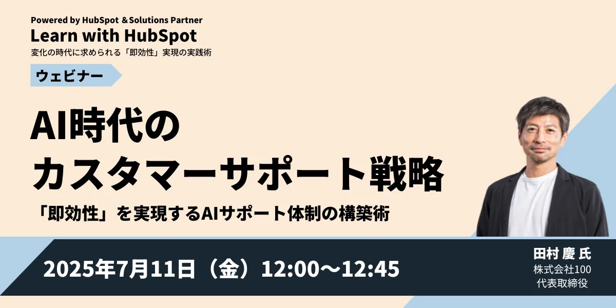 株式会社100(ハンドレッド)は、2025年7月8日から11日に開催されるHubSpot社主催のオンラインイベント「Learn with HubSpot 変化の時代に求められる『即効性』実現の実践術」に登壇します。特に7月11日(金)のセッションでは、AI技術を駆使したカスタマーサポート戦略に焦点を当て、株式会社100代表取締役の田村慶が「即効性のあるCX改善」をテーマに具体的なアプローチを紹介します。