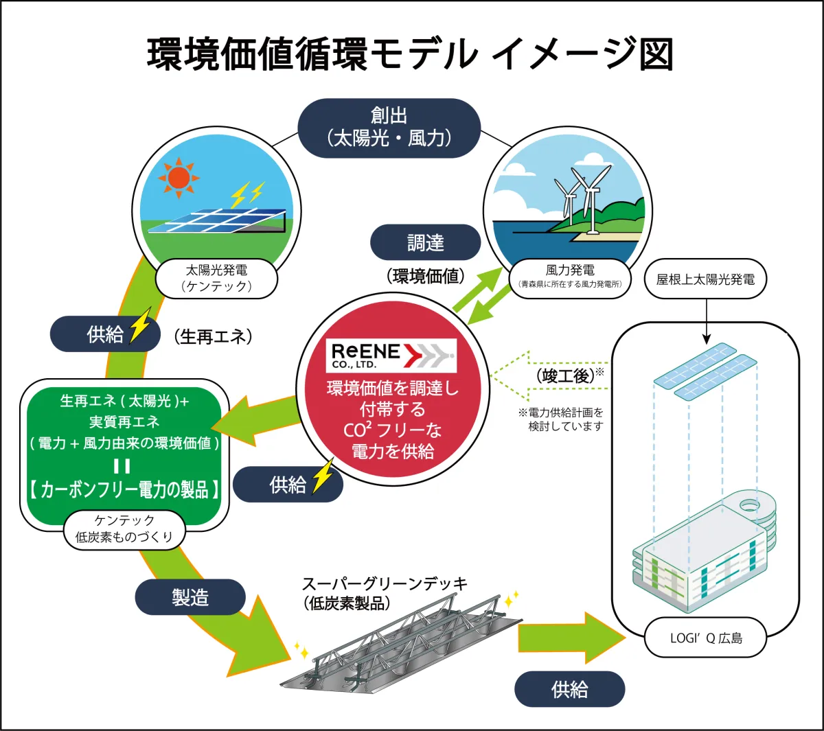 この協力により、ケンテックは広島県にて新たに開発される東急不動産の物流施設「LOGI’Q広島」に、サステナブルな製品「SUPER Green DECK」を供給します。この製品は、カーボンフリーの電力を用いて製造され、従来の製造プロセスに比べてGHG排出量を大幅に削減します。