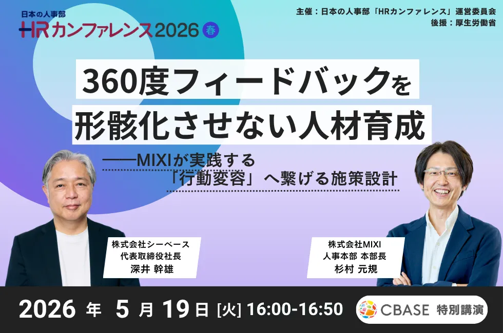 2026年5月19日、東京で開催される「HRカンファレンス2026(春)」において、株式会社シーベースが『360度フィードバックを形骸化させない人材育成MIXIが実践する「行動変容」へ繋げる施策設計』をテーマに特別対談セミナーを行います。このセミナーでは、株式会社MIXIの人事本部長、杉村元規氏とシーベース代表の深井幹雄氏が対談形式で、360度フィードバックの実践的な活用法について語ります。