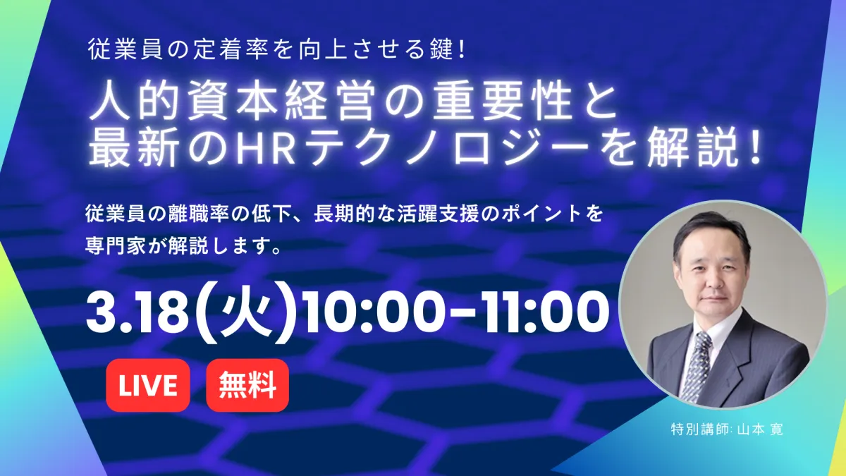 2025年3月18日(火)10時から11時まで、Zoomを使ったオンライン形式で行われる本セミナーでは、人的資本経営の重要性と最新のHRテクノロジーについて解説します。リテンションマネジメントの観点から、企業が実施するべき具体的な施策に焦点を当て、社員の本音を引き出すための「人事インタビュー」の効果的な実施方法と分析手法も紹介します。