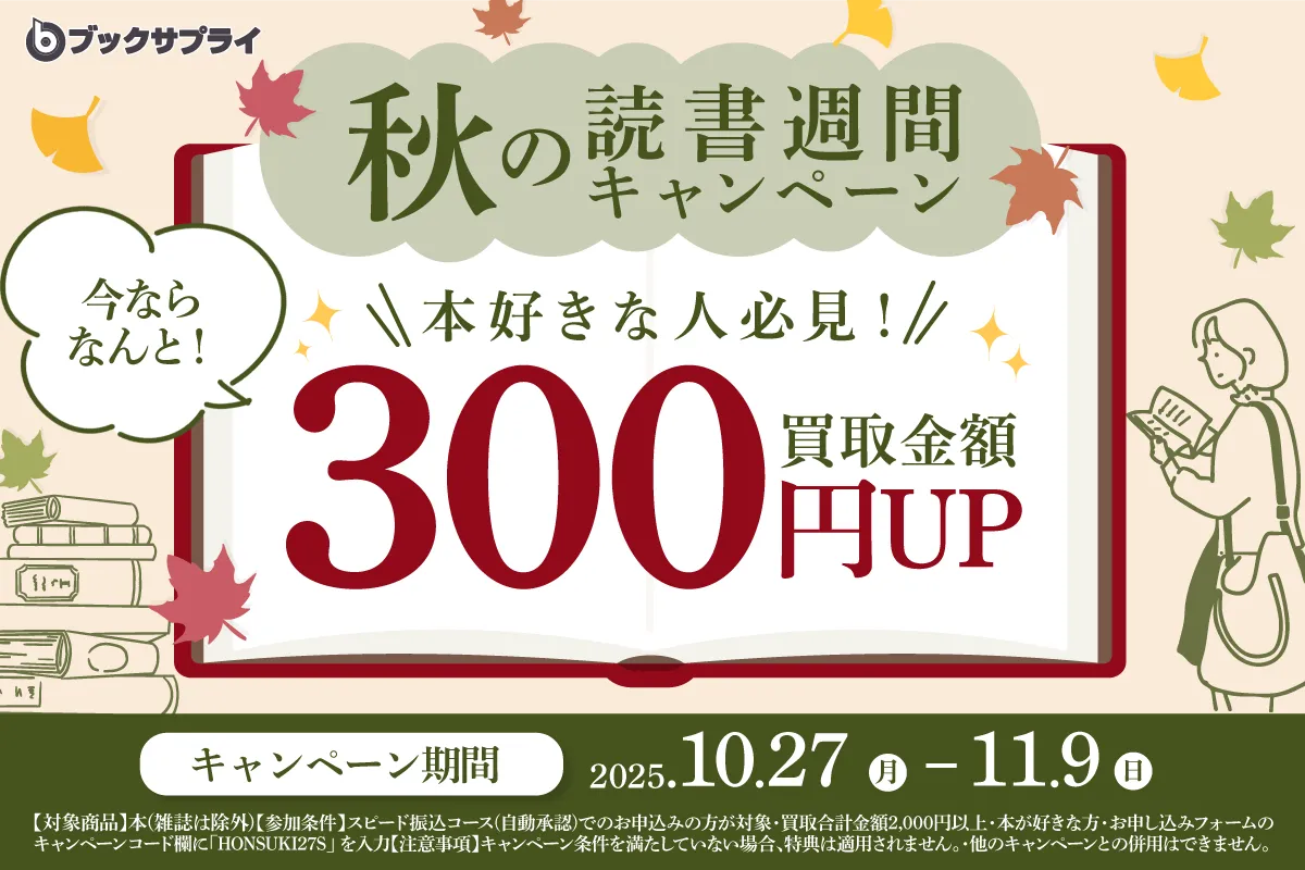 株式会社ブックサプライは、毎年恒例の「秋の読書週間キャンペーン」を2025年10月27日から11月9日にかけて開催します。読書が盛んなこの季節に、宅配買取を利用される方に向けて、特別なキャンペーンを用意しました。