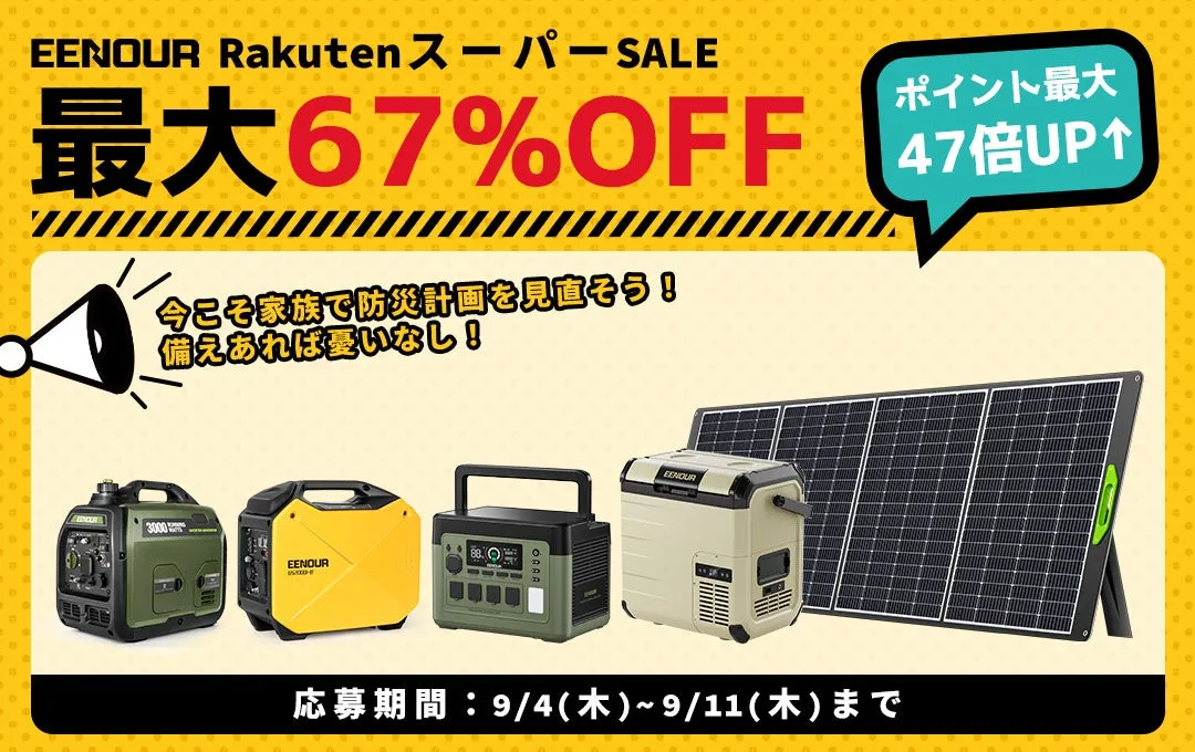 現在の楽天スーパーSALEは、家族で防災計画を見直す良い機会です。EENOURの製品を利用して、安心できる未来を手に入れましょう。このセールを活用して、防災アイテムを揃え、家族の備えを強化することをお勧めします。ぜひ、このチャンスをお見逃しなく!
