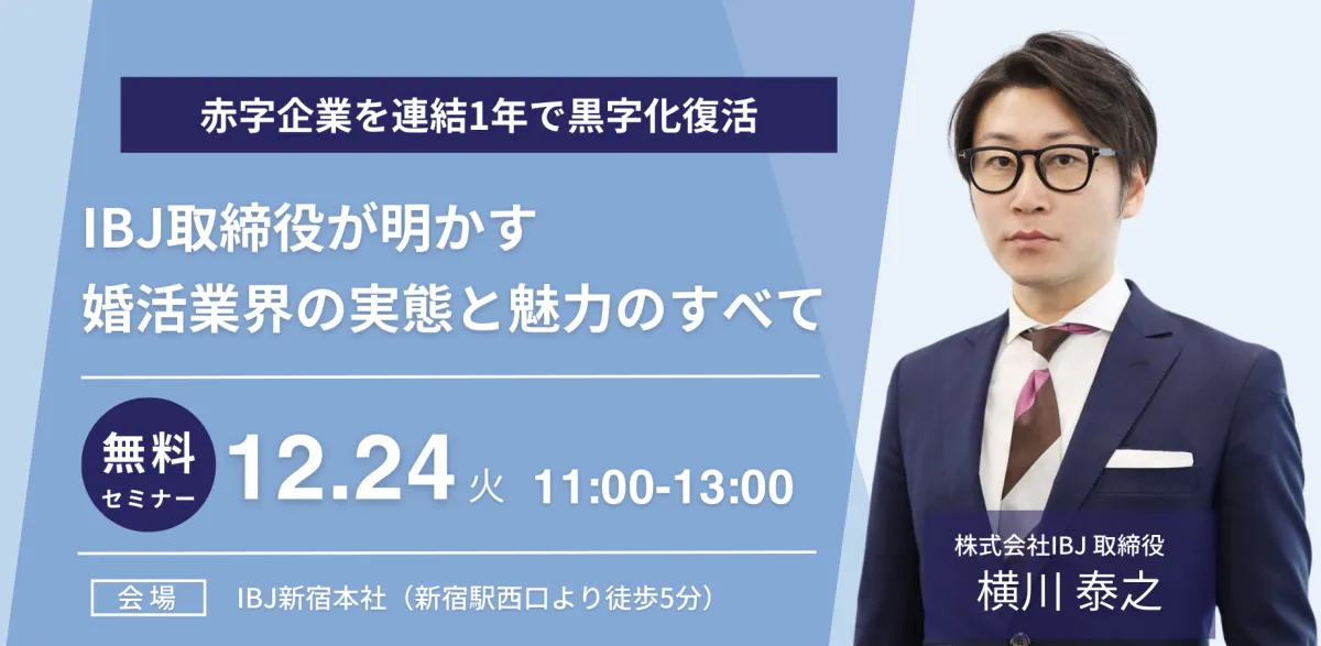 この特別セミナーでは、IBJの取締役である横川泰之氏が講師を務め、サンマリエというIBJグループの結婚相談所を連結してわずか1年で黒字化させた経験を元に、事業運営のポイントや成長の秘訣を初めて公開します。婚活業界の最新の動向や魅力について網羅し、参加者には結婚相談所の仕事の基礎から応用までをしっかりと学べる機会が提供されます。