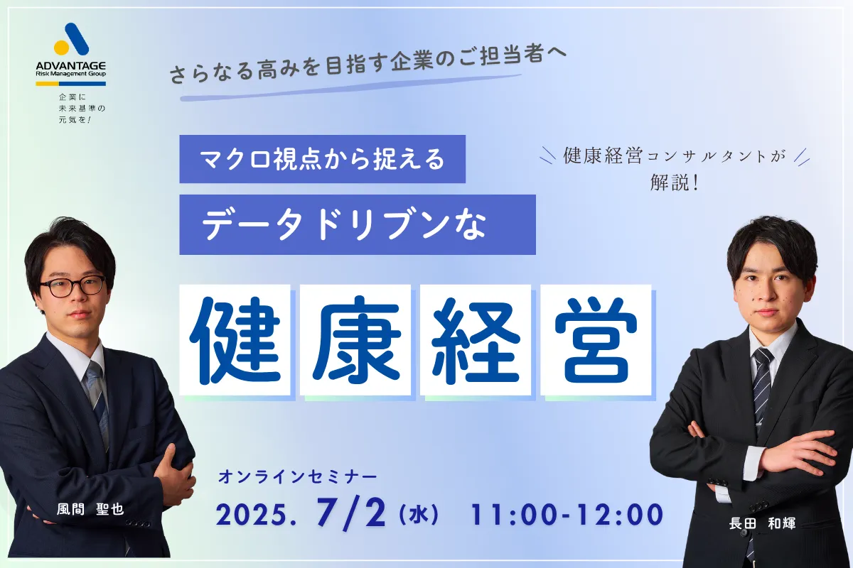 しかし、この健康経営の戦略を立てる際には、効果検証が欠かせません。そこで、2025年7月2日(水)に開催されるWebセミナー、「マクロ視点から捉えるデータドリブンな健康経営~戦略の軌道修正を導く効果検証のポイント~」が注目されています。このセミナーでは、経済産業省の健康経営度調査データと、アドバンテッジリスクマネジメントが保有するメンタルヘルス・エンゲージメントデータを基に、健康経営の指標を分析します。