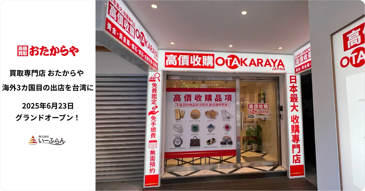 株式会社いーふらん(本社:神奈川県横浜市)が運営する買取専門店「おたからや」が、海外展開の一環として台湾に1号店をオープンしました。この店舗は、安定した経済基盤を持ち、日本文化に対する親和性が高い台湾における新たな拠点となります。