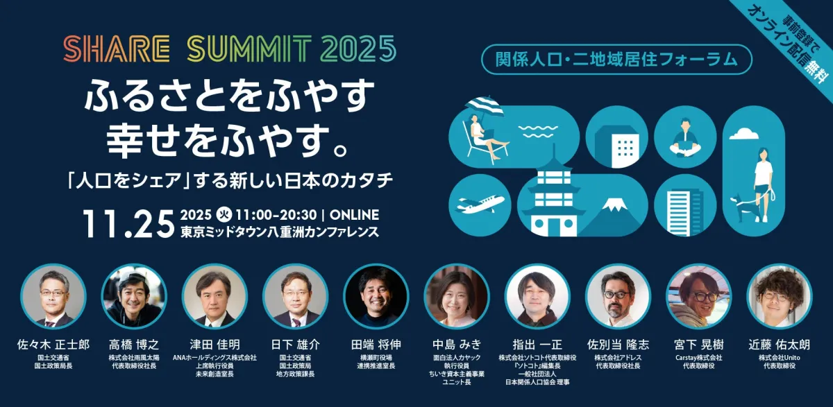 2025年11月25日(火)、東京ミッドタウン八重洲カンファレンスで『関係人口・二地域居住フォーラム』が開催されます。本イベントは、政府や自治体、企業、さらには個人までの多様な参加者が集うビジネスカンファレンス『SHARE SUMMIT(シェアサミット)』の一環として実施されます。