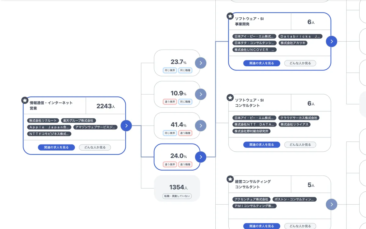 この機能は、過去のデータに基づく実績をもとに、どのようなキャリア遷移が実際に発生しているのかを地図形式で示します。たとえば、同じ職種から出発した女性がどの会社に転職しているか、また男性との遷移の違いが何かを把握することができます。