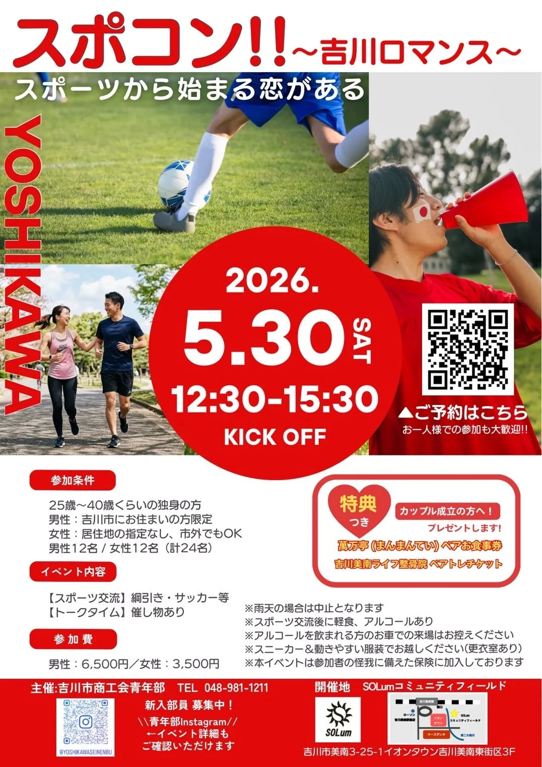 埼玉県吉川市にて、商工会青年部が主催する恋活イベント「スポコン!!~吉川ロマンス~スポーツからはじまる恋がある」が2026年5月30日に開催されることが決定しました。このイベントは、地域の活性化を目的にし、参加者がスポーツを通じて知り合い、さらには恋愛に発展することをサポートするものです。