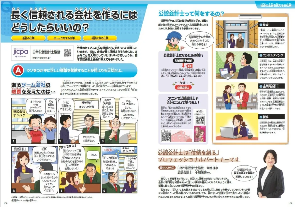 協賛により、掲載ページでは『長く信頼される会社を作るにはどうしたらいいの?』というテーマに基づき、漫画を通じて会社の信頼性を育むためのポイントが紹介されています。また、公認会計士がどのような分野で活動しているかを知ることができる内容も含まれ、学生たちの興味を引きつける工夫がされています。さらに、協会が制作した会計を楽しく学べるコンテンツ『一言のシン』も併せて紹介されます。