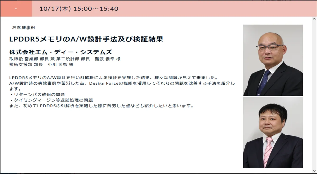 LPDDR5メモリの設計は、次世代の高速データ転送が可能なため、非常に注目されていますが、その設計には多くの課題が伴います。本講演では、特に失敗事例やその際に直面した問題について焦点を当て、それらの問題をどのように解決したのかについて具体的な手法を紹介します。